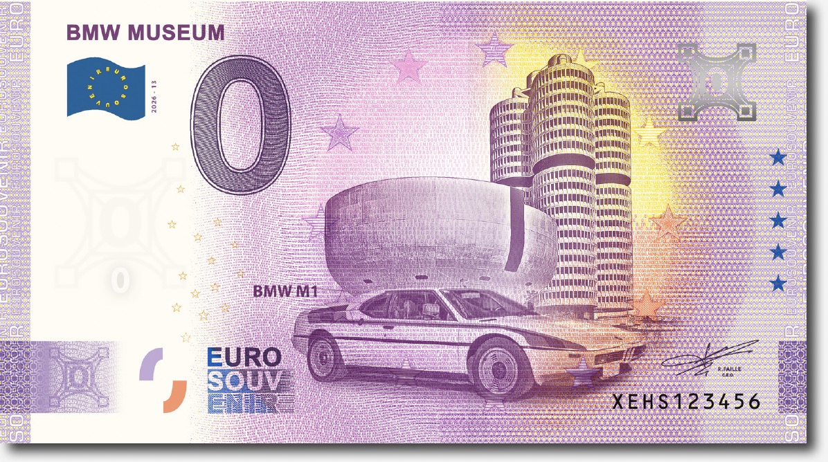 BMW Museum 0 Euro Schein mit dem legendären BMW M1 als Motiv. Die Rückseite zeigt berühmte europäische Wahrzeichen. Der BMW Museum Souvenir Schein wird in einer berühmten Druckerei gedruckt und verfügt - wie echte Euroscheine - über diverse Sicherheitsmerkmale. Limitierte Auflage.