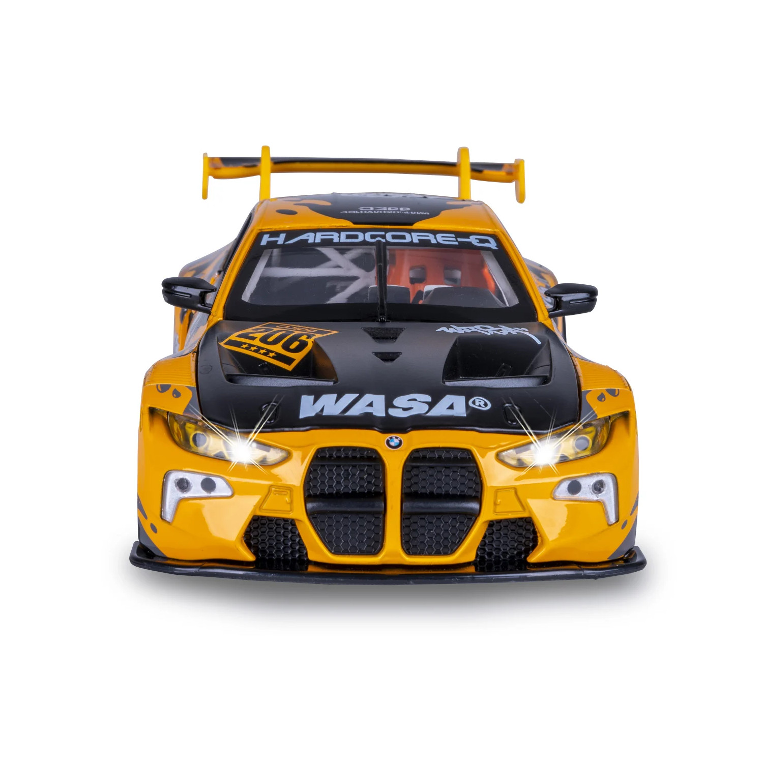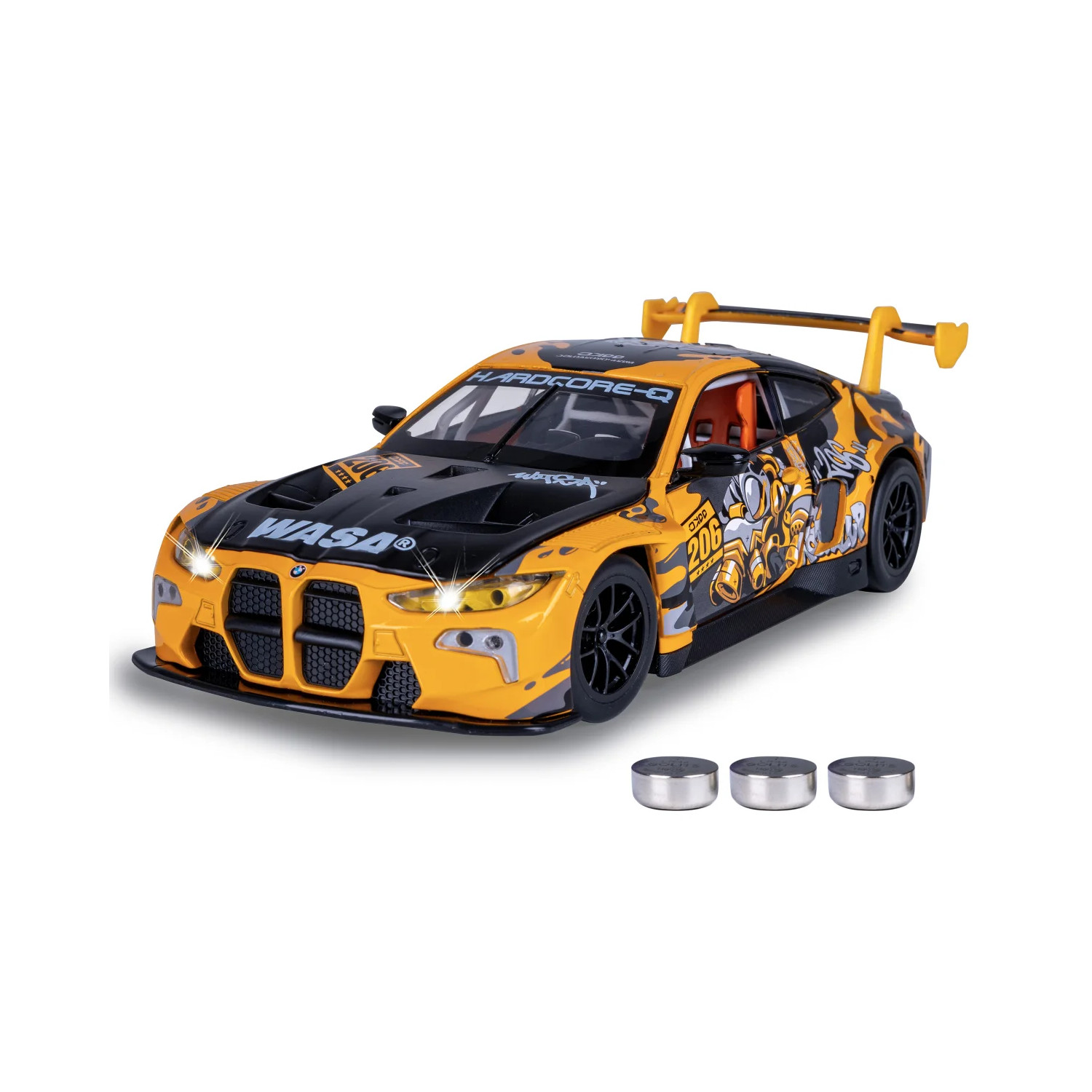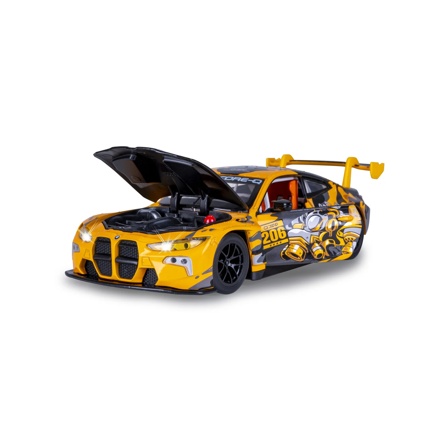 Entdecken Sie dieses detailgetreue Modell im hochwertigen Metall-DIECAST-Maßstab 1:24 – perfekt für jede Sammlung. Zahlreiche fein ausgearbeitete Elemente lassen die Herzen von Motorsportfans höherschlagen. Das offiziell lizenzierte Design und der originalgetreu nachgebildete Innenraum bringen die Faszination des echten Rennwagens eindrucksvoll zur Geltung. Im Cockpit findet eine Spielfigur Platz, während Gummireifen und eine klare Windschutzscheibe das realistische Erscheinungsbild unterstreichen. Dank integrierter LED-Beleuchtung sorgt der BMW M4 GT3 auch bei gedämpftem Licht für strahlende Auftritte. Türen und Motorhaube lassen sich manuell öffnen, und beim Betätigen der Karosserie oder beim Öffnen der Türen ertönen authentische Soundeffekte. Der BMW M4 GT3 ist nicht nur ein Blickfang in jeder Vitrine, sondern auch ein Highlight für Sammler und Liebhaber deutscher Hochleistungsfahrzeuge.