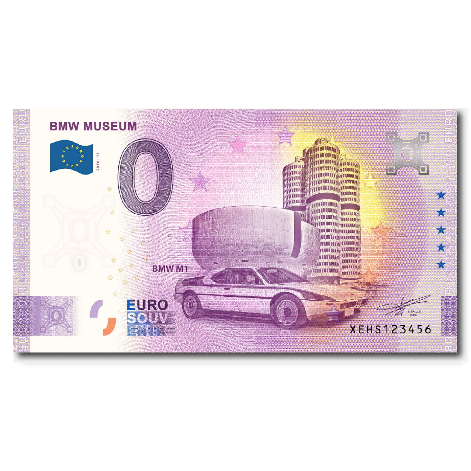 BMW Museum 0 Euro Schein mit dem legendären BMW M1 als Motiv. Die Rückseite zeigt berühmte europäische Wahrzeichen.